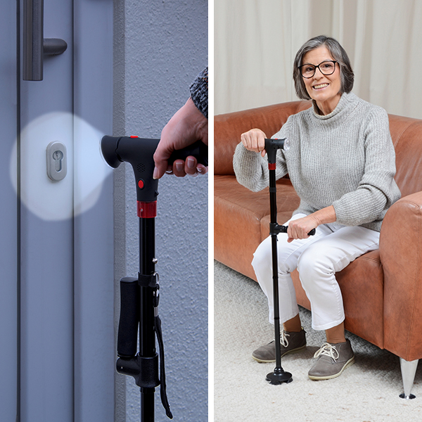 Ob Zuhause oder unterwegs, der praktische Gehstock leistet Ihnen nicht nur beim Gehen, sondern – mittels zusätzlichem Stützgriff – auch beim Aufstehen und Hinsetzen eine sichere Hilfestellung. Und auch bei Dunkelheit kann der innovative Gehstock mit Sicherheit überzeugen. Dank integriertem, leuchtstarkem LED-Licht sowie Alarmfunktion – mit Signalton und rotem Blinklicht – ist er bei der Suche nach dem Weg oder dem Schlüsselloch sowie bei Notfällen äusserst hilfreich.